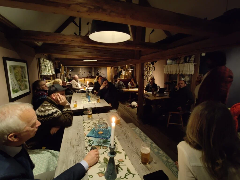 Kvällen fortsatte med ett besök hos en flitig entreprenör i Trondheim, Traditionsbygg i Trondheim AS, som har arbetat med kulturhistorisk bebyggelse i snart 2 decennier. Ägaren Torgeir Moslet och Jorunn, som driver Målarsvenneriet sedan 2006. De har en fantastisk gård, Saxenborg, strax innan Trondheim med gamla anor och de har verkstäder, välsorterad byggnadsvårdsbutik samt PUB på gården!
